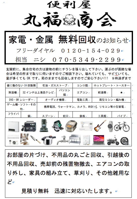 現在ご依頼件数が多いため、個人宅、マンション、少量の回収につきましては受付を停止させていただいております。